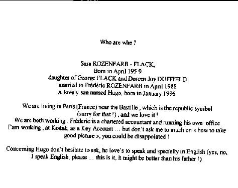 Nancy ( Ann Patricia ) FLACK is born in Paris the 17-03-1956 first daughter of Georges FLACK and Doreen DUFFIELD . She got married the 27 April 1984 in Paris with Pascal DALOUS born the 10-06-1954 in Paris also. They have 3 children all born in Paris : Donatien , ()7-05-1986; Arabelle , 20-07-1988 Melissande , 25-08-1992 They are living in Paris and have also a house in Normandie where they go often . Nancy is modeliste and works for french fashion designers. Pascal is archictecte and has his own buisness . b. 3 Apr 1959 m. 15 Apr 1988 Fred Rozenfarb